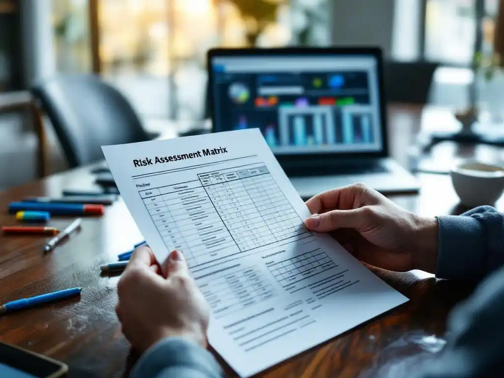Business analyst reviewing risk assessment matrix document with colored pens on conference table, laptop with data visible