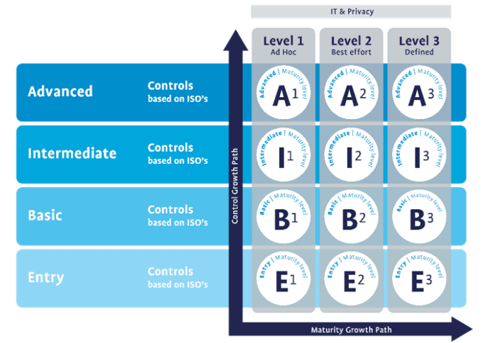 Elk niveau is weer onderverdeeld in drie volwassenheids-niveaus. Op deze manier kan de organisatie zien waar de verbeterpunten liggen en werken naar het opvolgende niveau.