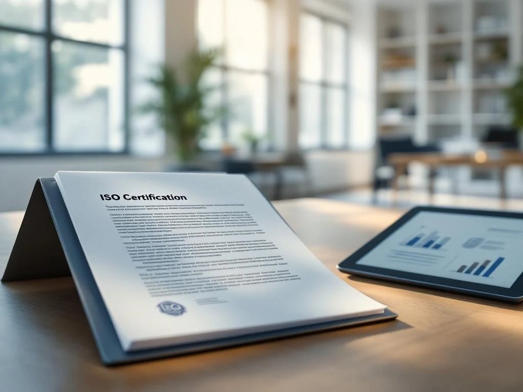 Modern office with legal documents, ISO certification badge and compliance charts on tablet on wooden desk