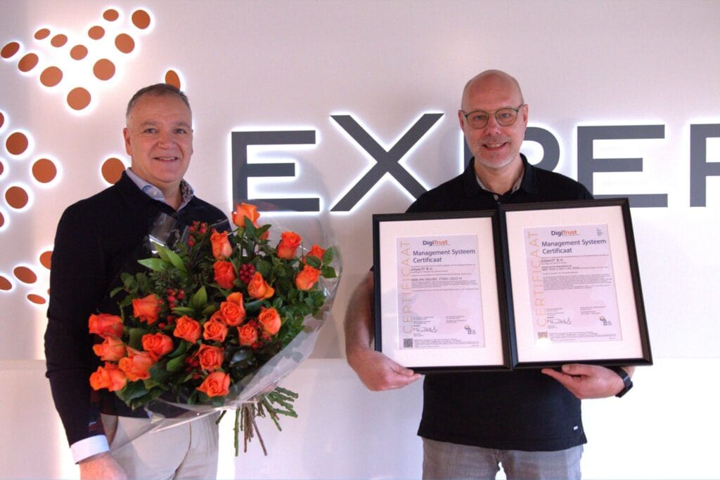 Recentelijk heeft Cees Ippel namens DigiTrust het nieuwe ISO27001:2023 en NEN7510:2017 certificaat mogen uitreiken aan Marcel Bruijniks van eXperIT. De organisatie zorgt voor ICT oplossingen in de zorg, onderwijs en zakelijke dienstverlening.